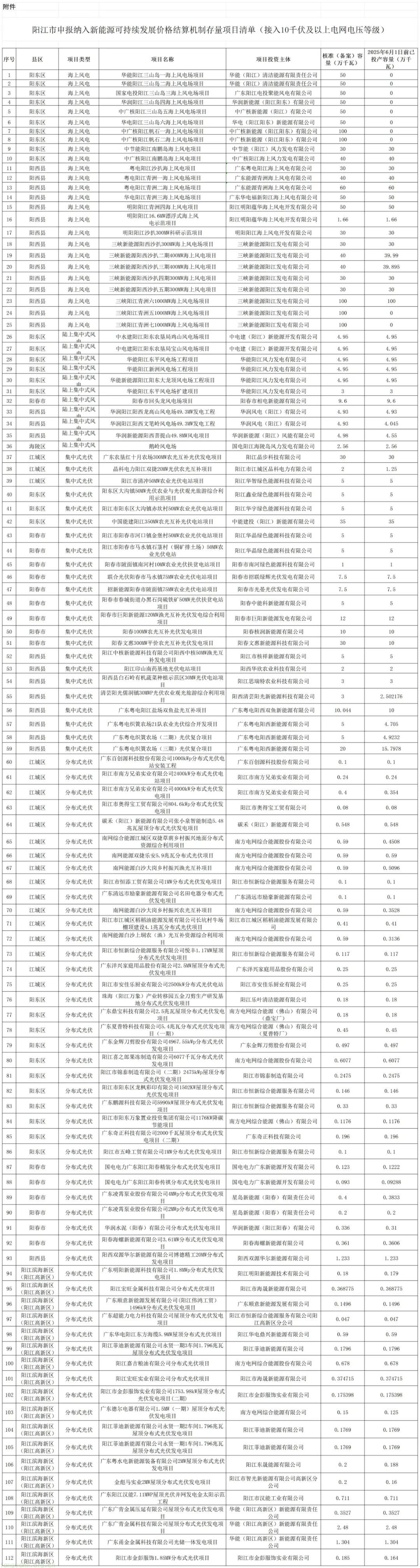 阳江市申报新能源可持续发展价格结算机制存量项目清单公示