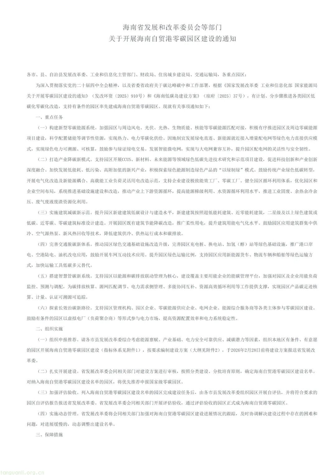 12 月 19 日,海南省发展和改革委员会等多部门联合发布《关于开展海南自贸港零碳园区建设的通知》,锚定园区能源系统零碳化转型核心目标,明确建设路径与量化指标,助力自贸港绿色低碳发展。