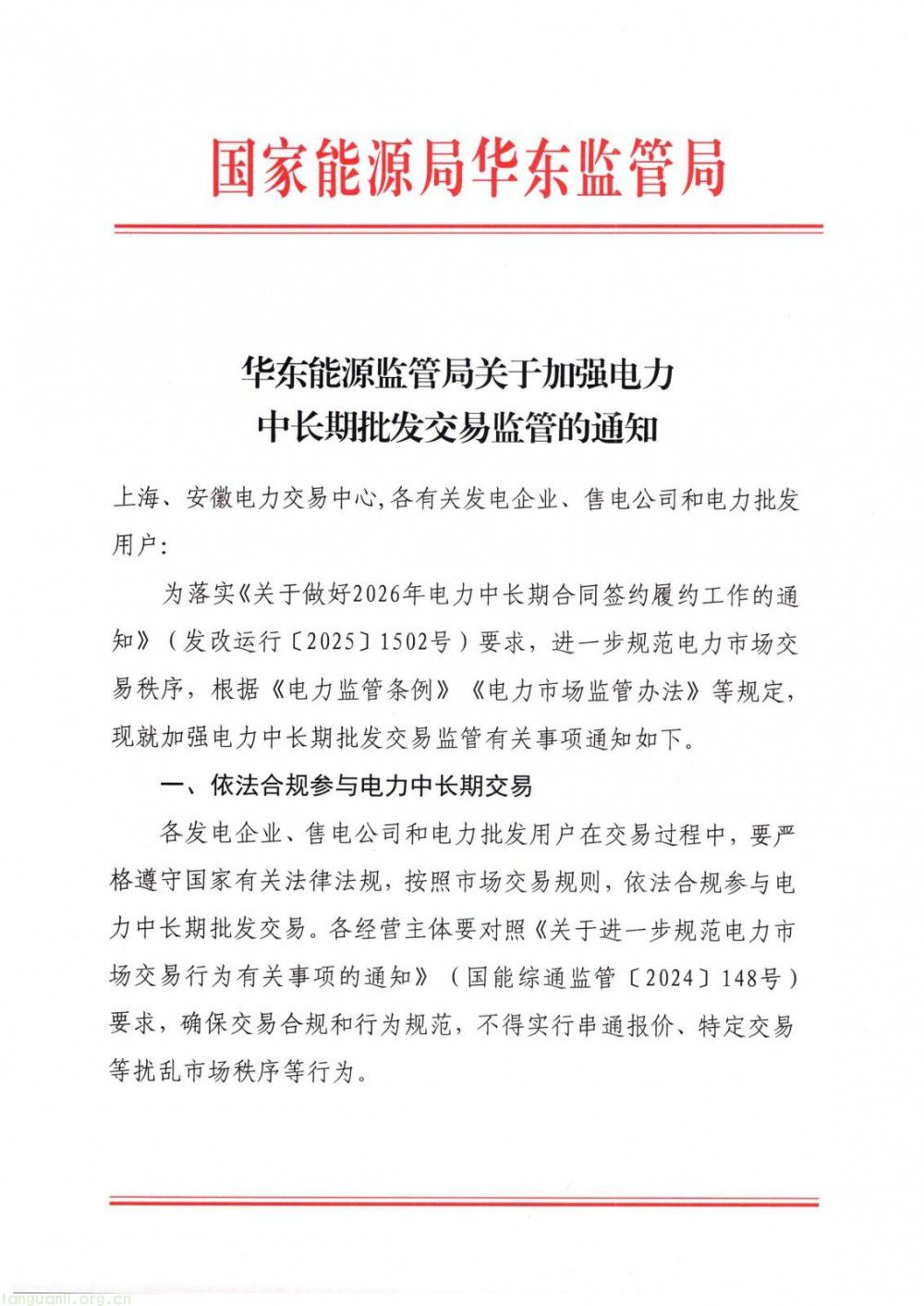 12 月 23 日,华东能源监管局发布华东能源监管局关于加强电力中长期批发交易监管的通知,旨在规范市场交易行为,维护公平有序的电力市场秩序。通知明确覆盖发电企业、售电公司、电力批发用户等全链条经营主体,要求其严格恪守国家法律法规及市场交易规则,依法合规参与交易。 通知重点强调,各经营主体需对标《关于进一步规范电力市场交易行为有关事项的通知》(国能综通监管〔2024〕148 号)要求,坚决杜绝串通报价、特定交易等扰乱市场秩序的行为。在报价环节,需综合考量机组固定成本、燃料成本、能源供需等客观因素,确保交易价格真实反映电力商品价值。针对 “发售一体” 经营主体,通知明确禁止其利用自身优势扰乱市场,不得对各类售电主体及电力大用户实施差别待遇。