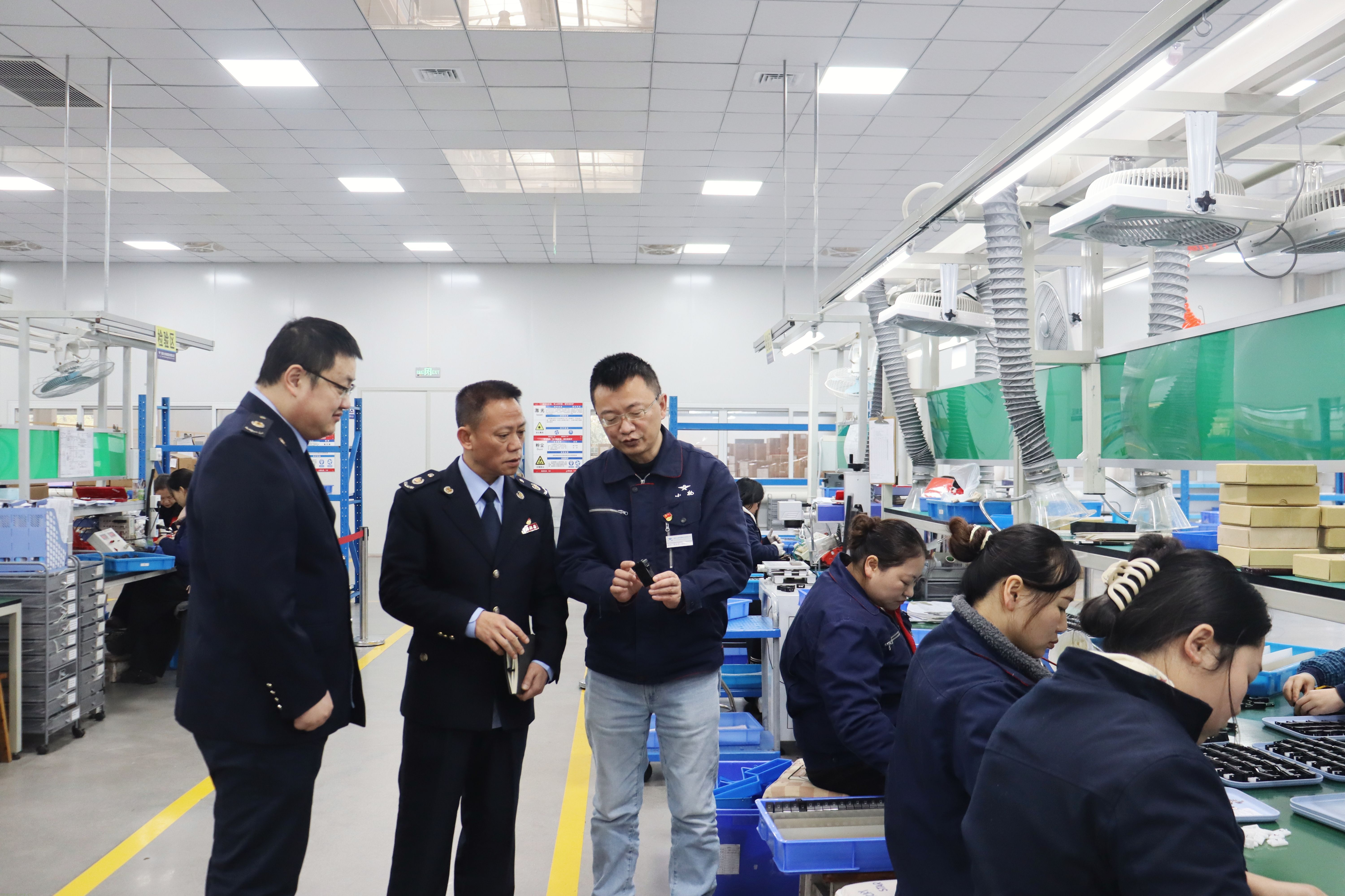税务干部走进小航电器生产车间,了解企业生产经营情况,宣传税收政策,引导合规经营。