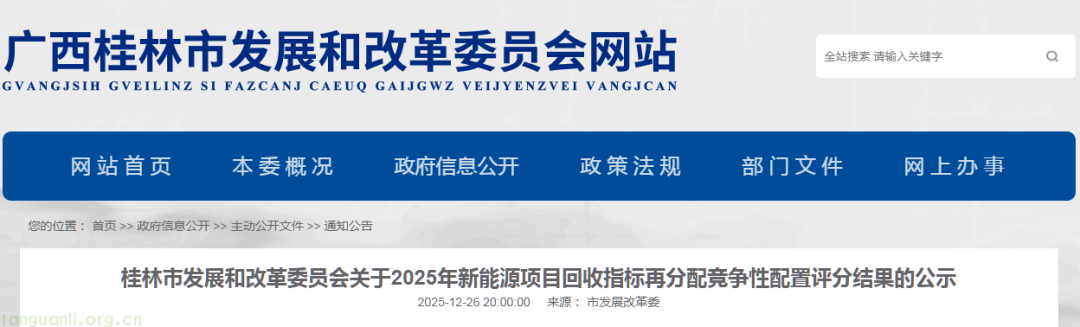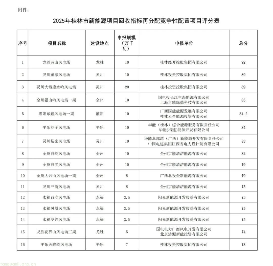 桂林市发展和改革委员会关于2025年新能源项目回收指标再分配竞争性配置评分结果的公示