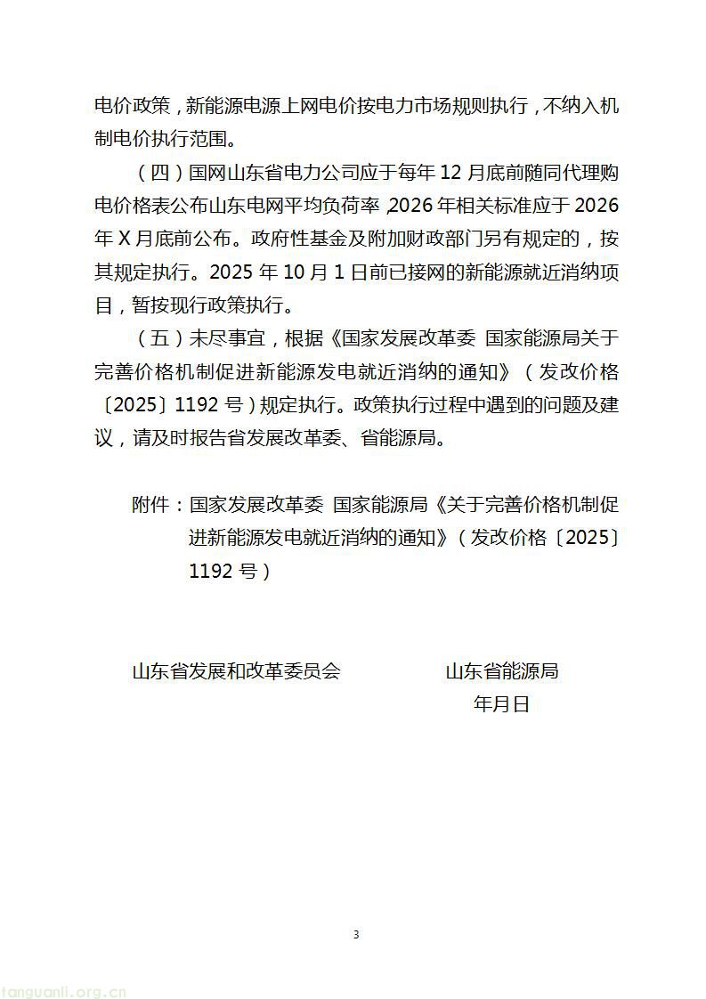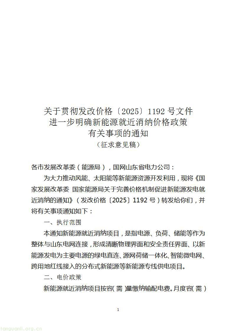 为推动新能源资源开发利用,贯彻落实《国家发展改革委 国家能源局关于完善价格机制促进新能源发电就近消纳的通知》(发改价格〔2025〕1192号),我委起草了《关于贯彻发改价格〔2025〕1192号文件进一步明确新能源就近消纳价格政策有关事项的通知(征求意见函)》。现向社会公开征求意见建议。有关意见建议请于2月28日至3月6日期间发送至邮箱cuike@shandong.cn,邮件主题请注明“新能源就近消纳价格政策意见建议+单位/个人名称”。感谢您的参与和支持!
