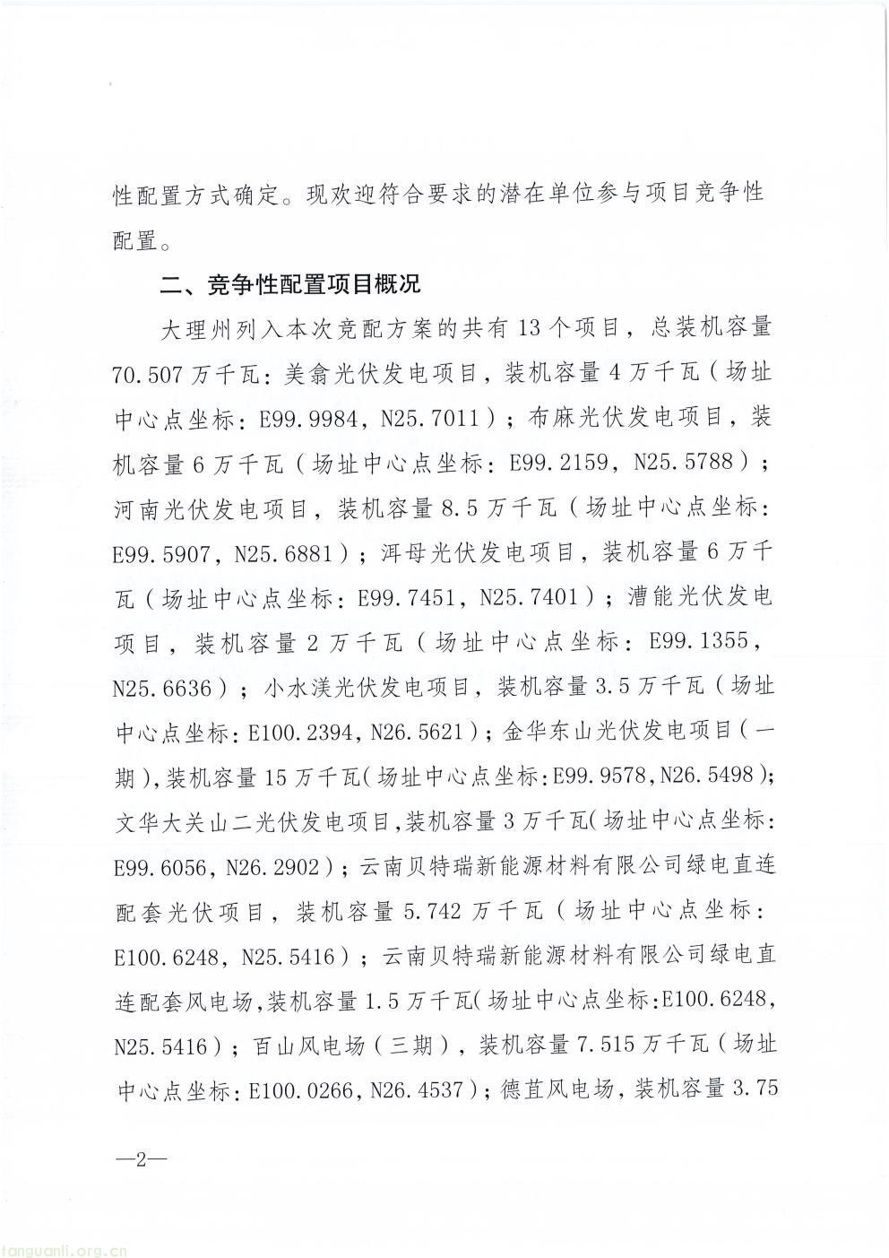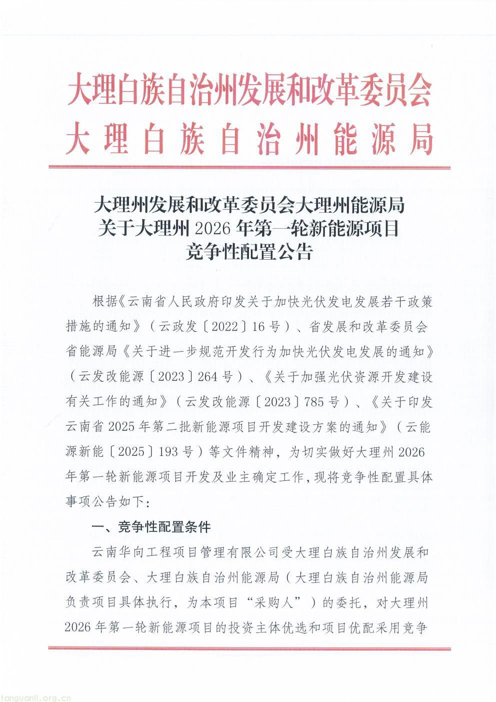 3 月 5 日,云南省大理州发展改革委、州能源局发布 2026 年第一轮新能源项目竞争性配置公告。本次共安排 13 个新能源项目参与竞争配置,总装机容量 70.507 万千瓦,其中光伏项目 9 个、规模 53.742 万千瓦,风电项目 4 个、规模 16.765 万千瓦。项目计划于 2026 年 6 月开工建设,2027 年 2 月实现并网投产。公告明确,风电项目参照光伏项目实行市场化配置,开发建设管理按照国家及云南省风电相关政策执行。大理州通过规范有序开展新能源项目竞争性配置,进一步优化能源结构,加快推动绿色能源开发利用,助力区域新能源产业高质量发展和碳达峰碳中和目标实现。