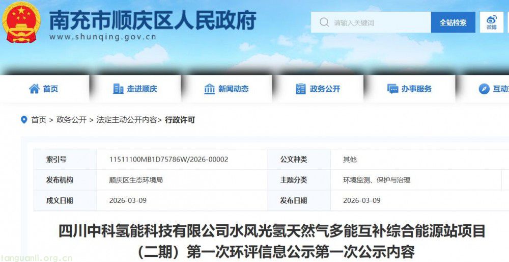 近日,南充市顺庆区人民政府正式发布四川中科氢能科技有限公司水风光氢天然气多能互补综合能源站项目(二期)第一次环评信息公示,全面披露该项目的核心建设相关信息,为项目后续推进奠定基础。