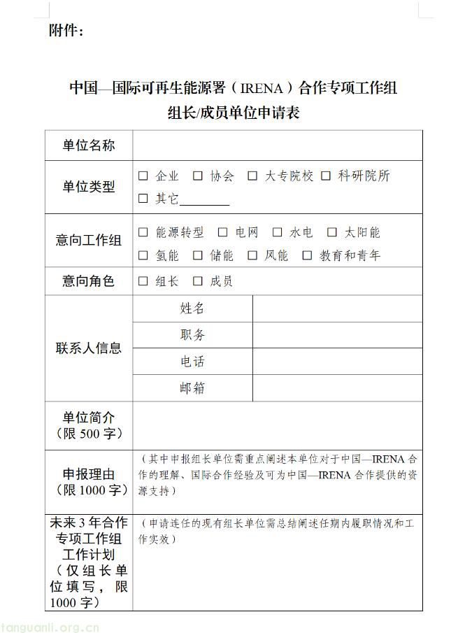 附件:中国—国际可再生能源署(IRENA)合作专项工作组组长/成员单位申请表