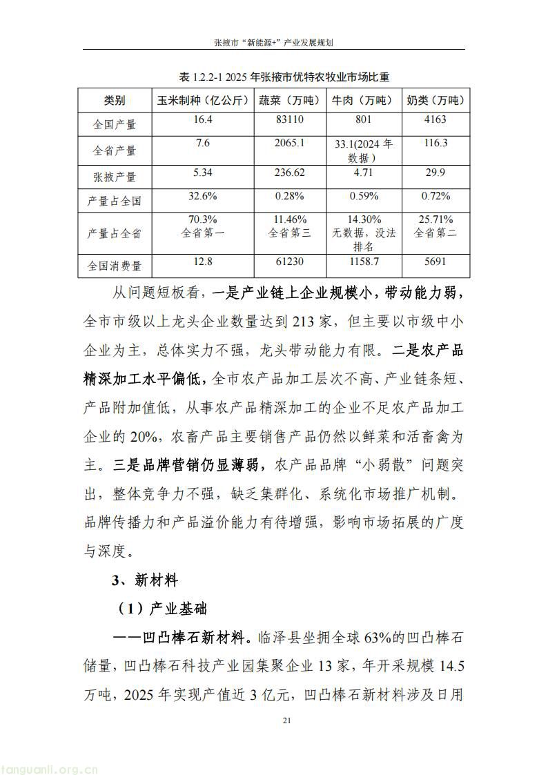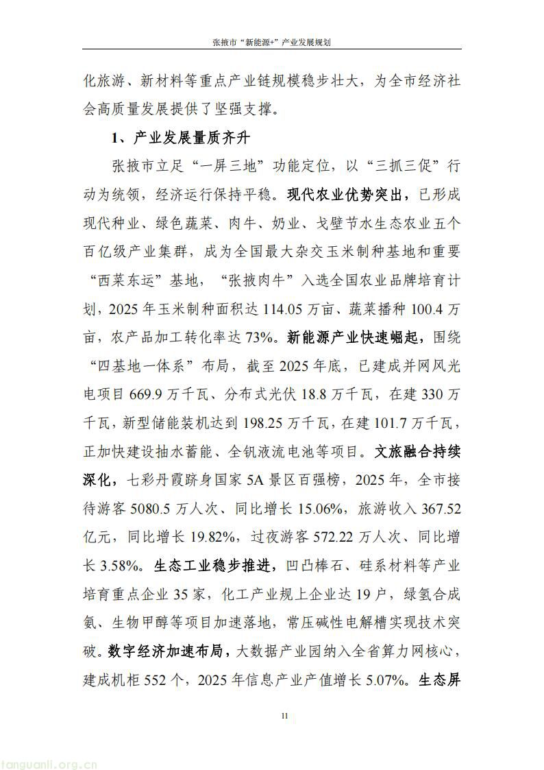 4 月 10 日,张掖市发改委就《张掖市 “新能源 +” 产业发展规划》公开征求公平竞争审查意见。规划提出,2030 年全市新能源装机目标20GW,可再生能源发电量占比达92%。风电方面,已建成并网244.7 万千瓦、在建245 万千瓦、拟建300 万千瓦,剩余可开发510.3 万千瓦;2025 年风电发电量34.68 亿千瓦时,占比23.6%。规划坚持系统优化、多能互补、高效集成,统筹风光资源与土地空间,构建集中式与分布式并举、发电与调节协同、能源开发与生态保护融合的新型能源格局,夯实绿色低碳能源基底,支撑 “新能源 +” 产业高质量发展。