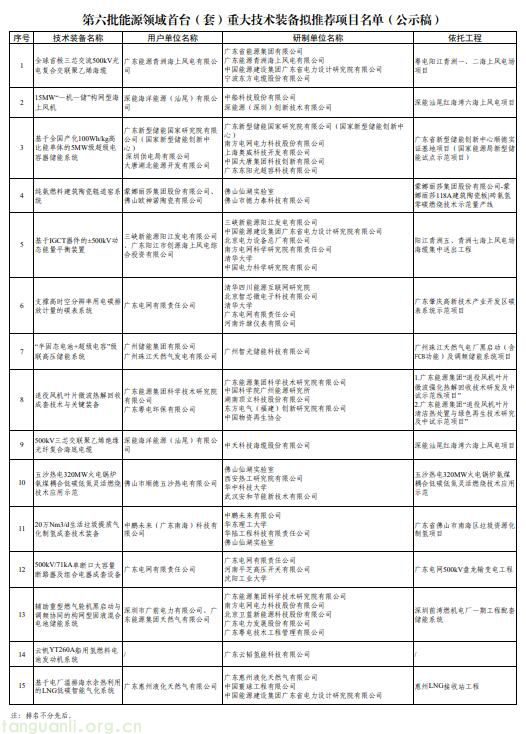 广东省能源局关于第六批能源领域首台(套)重大技术装备推荐上报项目的公示