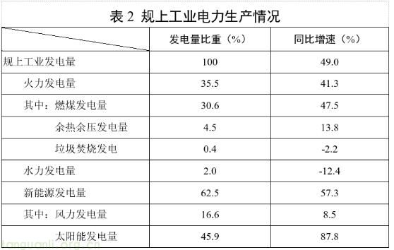 电力生产量同比上升。一季度,规上工业发电量同比增长49.0%。其中,火力发电量同比增长41.3%,占规上工业发电量的35.5%;水力发电量同比下降12.4%,占比2%;新能源发电量同比增长57.3%,占比62.5%。
