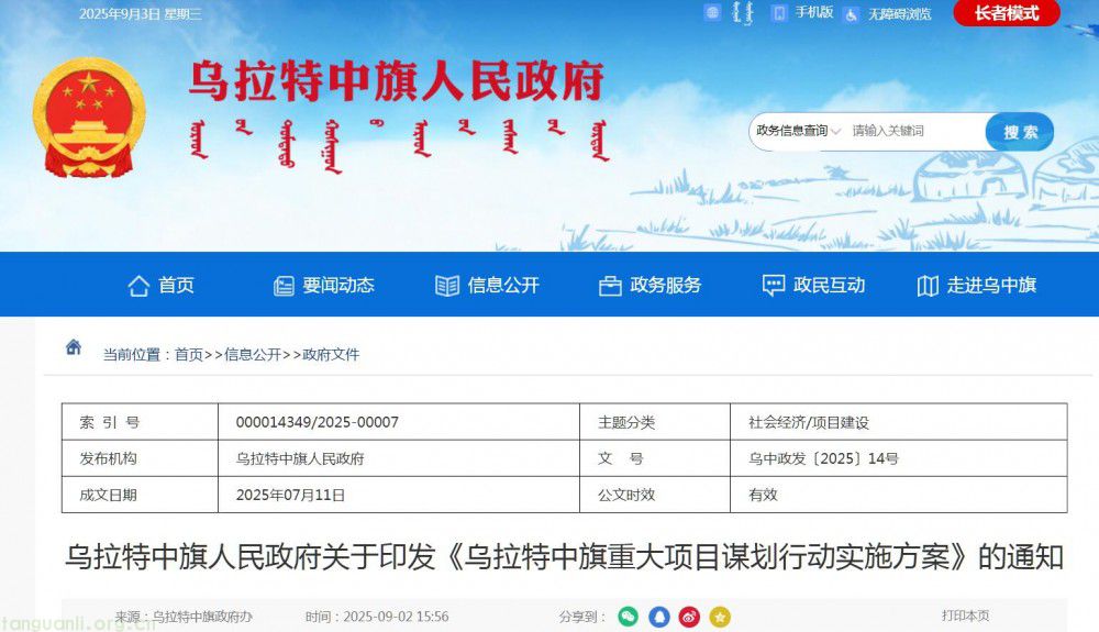 乌拉特中旗人民政府关于印发《乌拉特中旗重大项目谋划行动实施方案》的通知