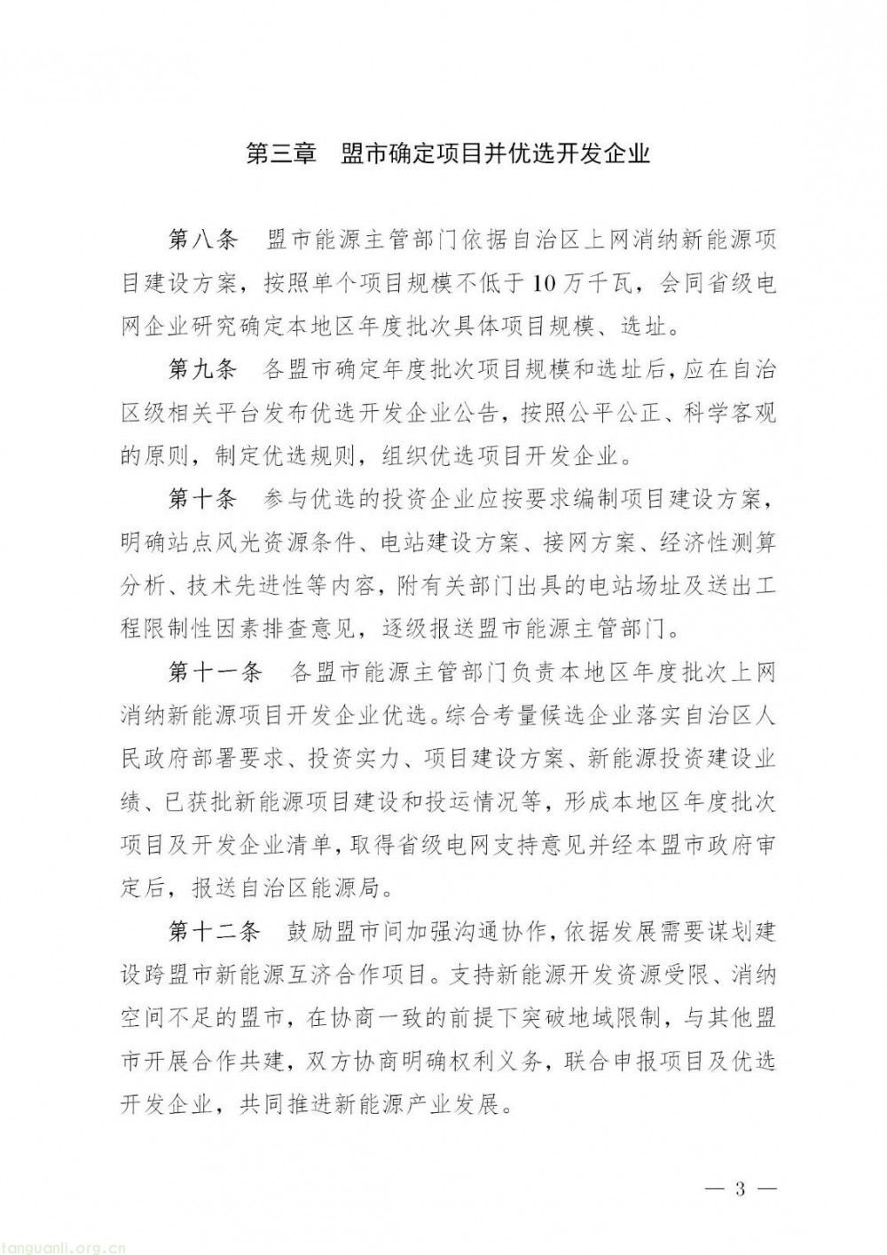 第八条 盟市能源主管部门依据自治区上网消纳新能源项目建设方案,按照单个项目规模不低于10万千瓦,会同省级电网企业研究确定本地区年度批次具体项目规模、选址。