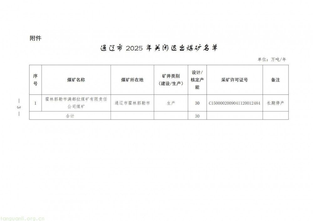按照《国务院关于煤炭行业化解过剩产能实现脱困发展的意见》(国发〔2016〕7号)等要求,经企业申请、自治区能源局同意,现将霍林郭勒市满都拉煤矿有限责任公司煤矿列入2025年关闭退出计划。现予以公告,接受社会监督。该矿申请不享受中央和自治区奖补资金,产能指标自主交易,职工安置和债务处置工作均由企业负责,并履行矿山生态修复主体责任。请相关部门按管理权限,对有关证照、批复文件及时予以注(吊、撤)消,并进行公告;停止对其生产供电、供水。