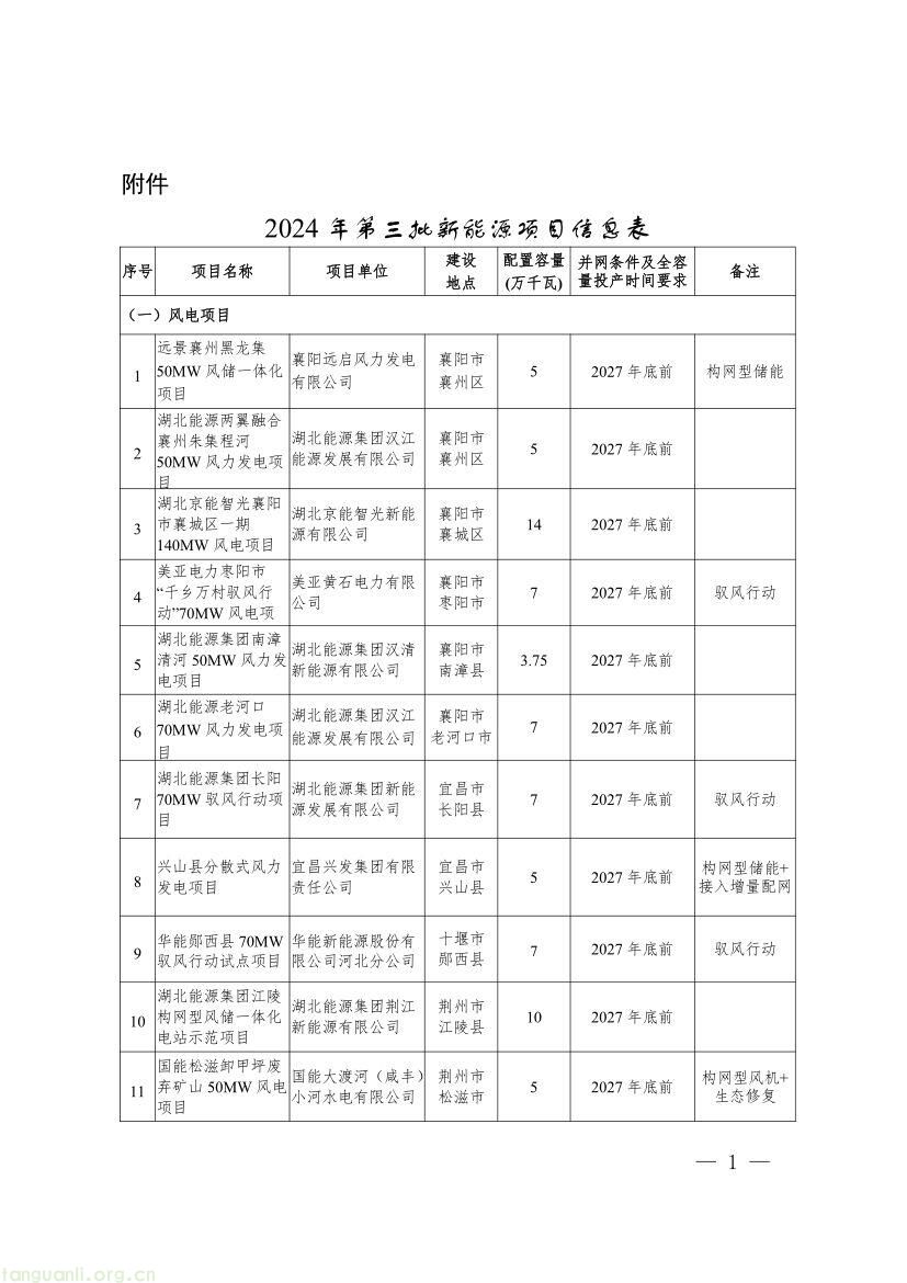 222.6 万千瓦!湖北公布 2024 年第三批新能源发电项目,含 30 个风电、2 个光伏,7 项目配置储能