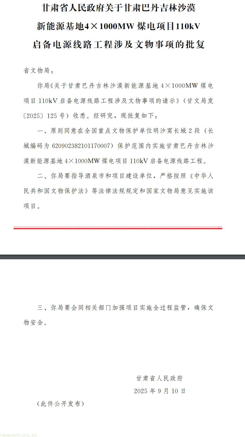 你局《关于甘肃巴丹吉林沙漠新能源基地4×1000MW煤电项目110kV启备电源线路工程涉及文物事项的请示》(甘文局发〔2025〕125号)收悉。经研究,现批复如下: