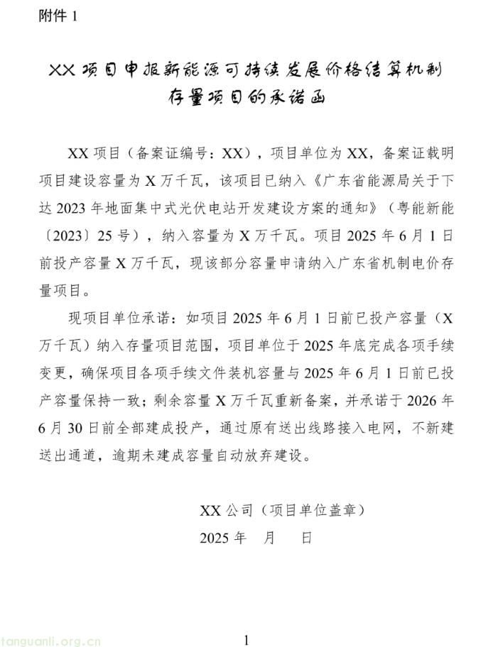附件:1.XX项目申报新能源可持续发展价格结算机制存量项目的承诺函