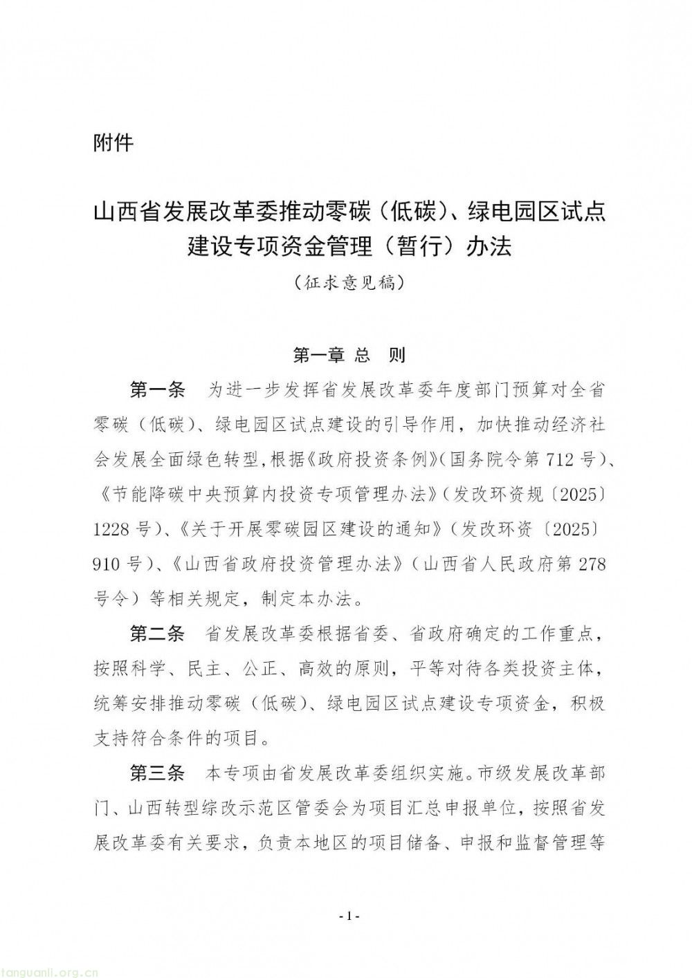 为进一步发挥省发展改革委年度部门预算对全省零碳(低碳)、绿电园区试点建设的引导作用,加快推动经济社会发展全面绿色转型,根据《政府投资条例》(国务院令第712号)、《节能降碳中央预算内投资专项管理办法》(发改环资规〔2025〕1228号)、《关于开展零碳园区建设的通知》(发改环资〔2025〕910号)、《山西省政府投资管理办法》(山西省人民政府第278号令)等相关规定,我委研究起草了《山西省发展改革委推动零碳(低碳)、绿电园区试点建设专项资金管理(暂行)办法(征求意见稿)》,现面向社会公开征求意见。