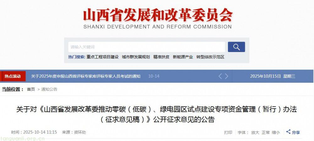 10 月 14 日,山西省发展和改革委员会发布公告,就《山西省发展改革委推动零碳(低碳)、绿电园区试点建设专项资金管理(暂行)办法(征求意见稿)》公开征求意见,进一步明确专项资金的核心细则。