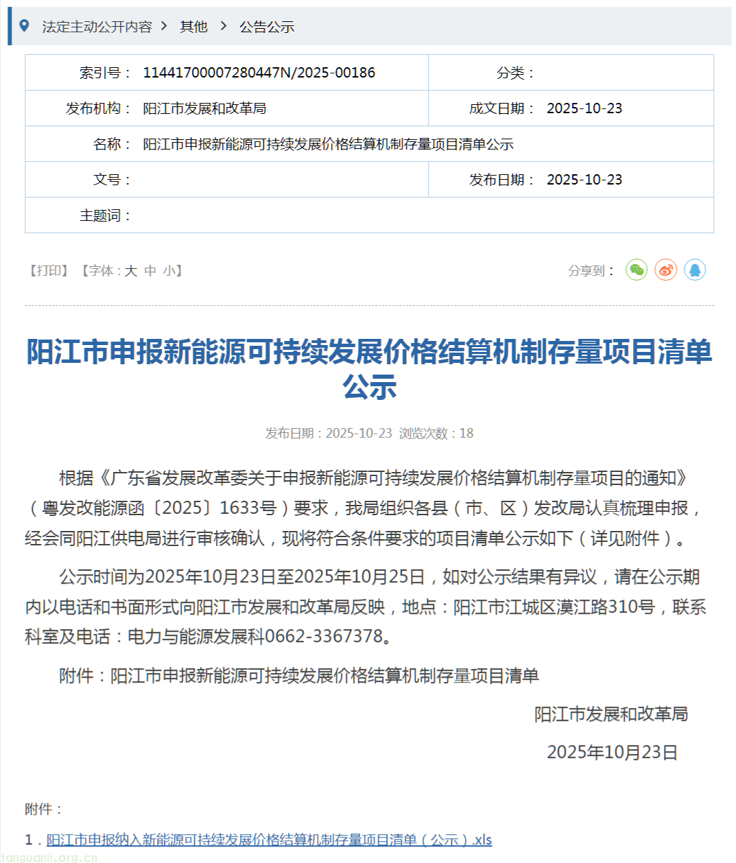 根据《广东省发展改革委关于申报新能源可持续发展价格结算机制存量项目的通知》(粤发改能源函〔2025〕1633号)要求,我局组织各县(市、区)发改局认真梳理申报,经会同阳江供电局进行审核确认,现将符合条件要求的项目清单公示如下(详见附件)。