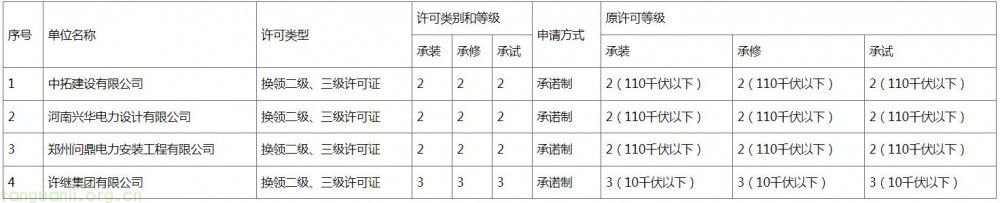 根据《承装(修、试)电力设施许可证管理办法》《电力业务许可证管理规定》,按照国家能源局全面推行电力业务许可告知承诺制实施方案的要求,经审查(告知承诺制方式),准予以下企业行政许可: