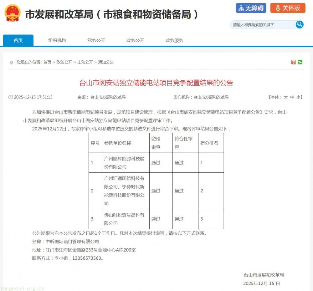 台山市阁安站独立储能电站项目竞争配置结果的公告