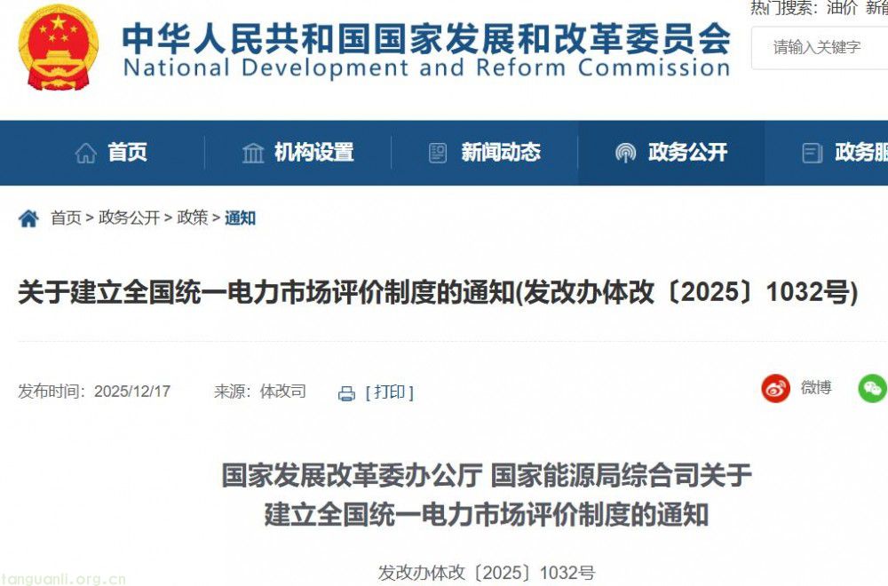 12月17日,国家发展改革委办公厅、国家能源局综合司联合发布《关于建立全国统一电力市场评价制度的通知》,明确构建科学动态的评价体系,为全国统一电力市场建设与监管提供决策支撑,助力新型电力系统构建。 通知确立四大核心评价维度,构建多维度综合评价框架。**电力市场运营效果**聚焦规则体系完整性、技术标准适配性、运营规范度及监管效能,要求实现中长期、现货等市场全覆盖,保障交易结算精准与技术系统可靠。市场作用发挥**侧重电力要素跨区流通、安全保供支撑、环境效益提升及经济效益优化,通过市场机制促进新能源消纳与绿电交易扩容。 经营主体可持续发展**维度明确市场需为储能、虚拟电厂等新业态提供空间,推动民营企业参与以带动产业链成长,助力能源新质生产力培育。如虚拟电厂可聚合分散资源参与多类市场交易,拓宽收益渠道的同时提升系统调节能力,成为新业态发展典型范例。市场竞争充分度**则强调统一开放与有序竞争,要求健全信用机制,有效约束市场力滥用与报价异常等行为,防控供需与价格波动风险。 实施安排上,自2026年起组织全国统一评价并制定标准,鼓励地方因地制宜开展评价,支持市场运营机构进行量化评估以精准发现问题。此次制度建立既是落实全国统一电力市场体系建设要求的关键举措,也为统筹安全保供、绿色转型与效率提升提供了长效保障。