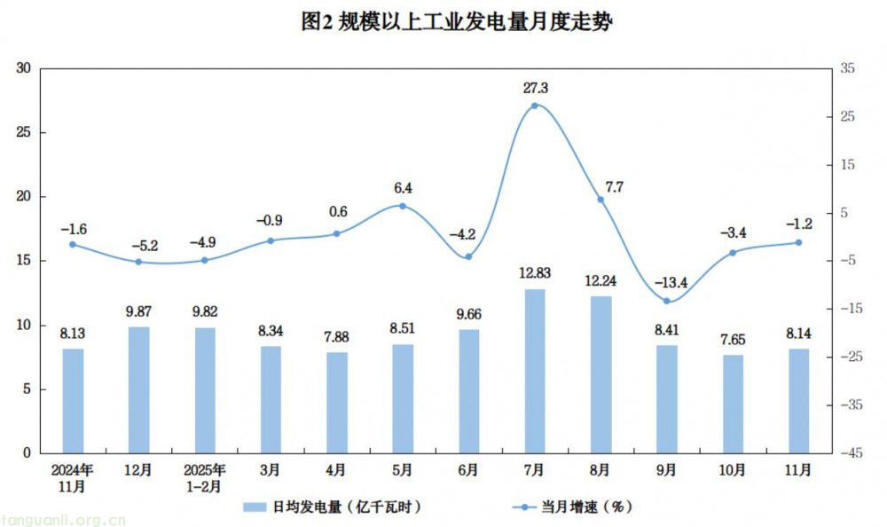 电力生产小幅下降,与上月相比降幅收窄。11月份,规模以上工业发电量244.30亿千瓦时,同比下降1.2%,降幅比10月份收窄2.2个百分点,日均发电8.14亿千瓦时。