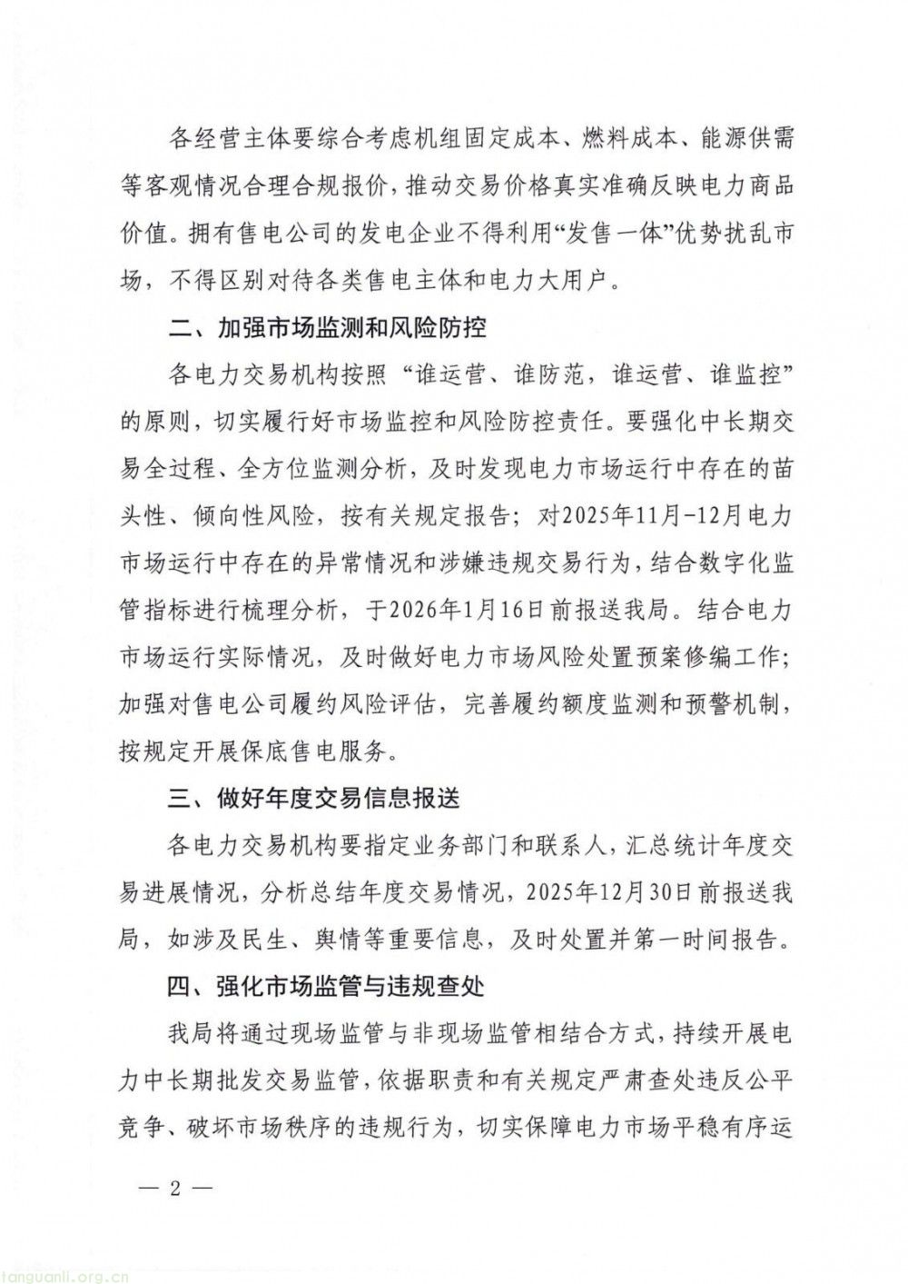12 月 23 日,华东能源监管局发布华东能源监管局关于加强电力中长期批发交易监管的通知,旨在规范市场交易行为,维护公平有序的电力市场秩序。通知明确覆盖发电企业、售电公司、电力批发用户等全链条经营主体,要求其严格恪守国家法律法规及市场交易规则,依法合规参与交易。 通知重点强调,各经营主体需对标《关于进一步规范电力市场交易行为有关事项的通知》(国能综通监管〔2024〕148 号)要求,坚决杜绝串通报价、特定交易等扰乱市场秩序的行为。在报价环节,需综合考量机组固定成本、燃料成本、能源供需等客观因素,确保交易价格真实反映电力商品价值。针对 “发售一体” 经营主体,通知明确禁止其利用自身优势扰乱市场,不得对各类售电主体及电力大用户实施差别待遇。