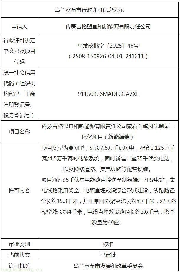 2025 年 12 月 23 日,内蒙古乌兰察布市发改委正式发布核准批复,同意内蒙古格盟宜和新能源有限责任公司察右前旗风光制氢一体化项目(新能源端)开工建设,这一项目的落地是内蒙古践行氢能产业高质量发展政策的重要实践,为区域绿氢产业布局再添关键支撑。