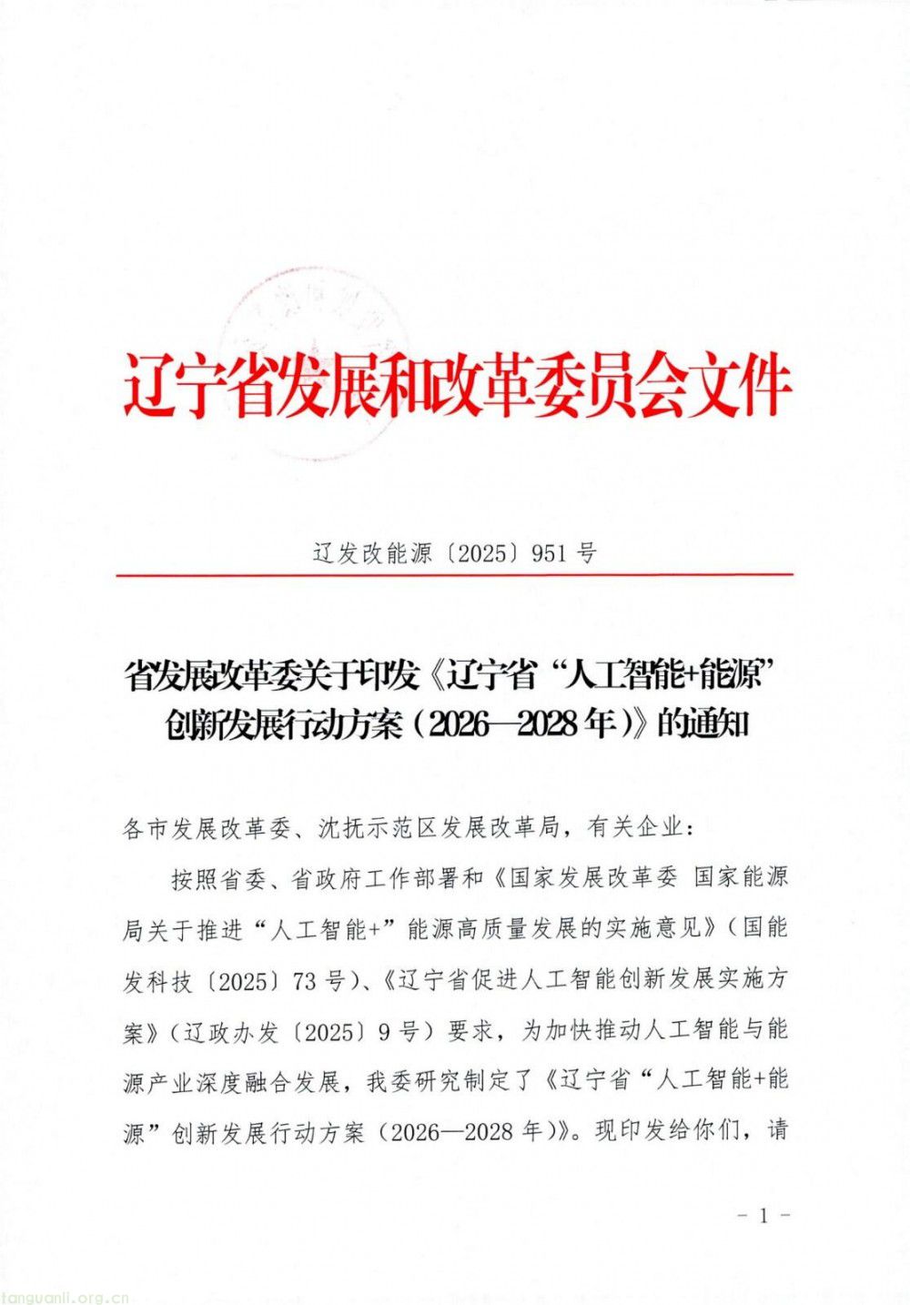 2025 年 12 月 26 日,辽宁省发展改革委印发《辽宁省 “人工智能 + 能源创新发展行动方案 (2026-2028 年)》,明确未来三年以人工智能赋能能源产业转型的核心路径。