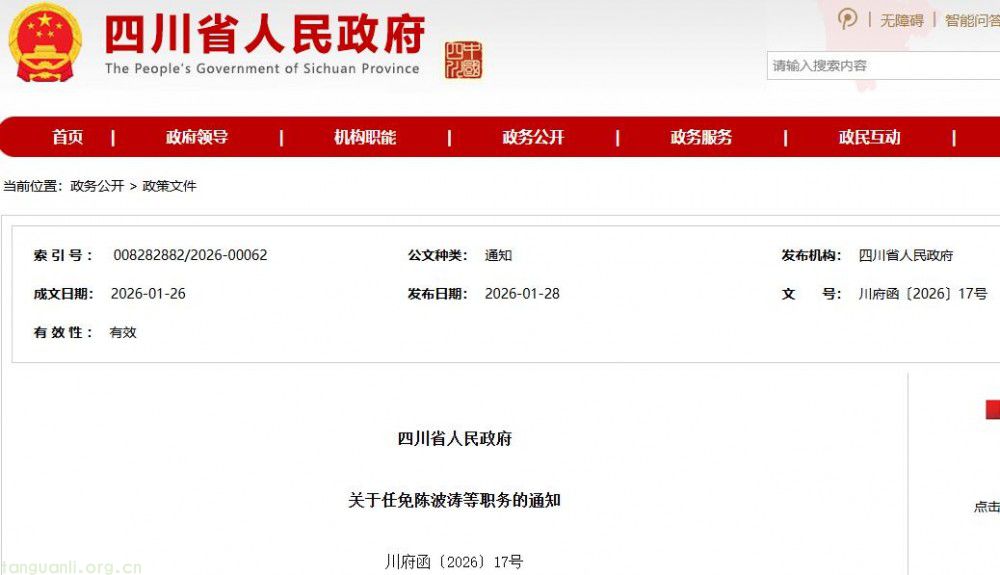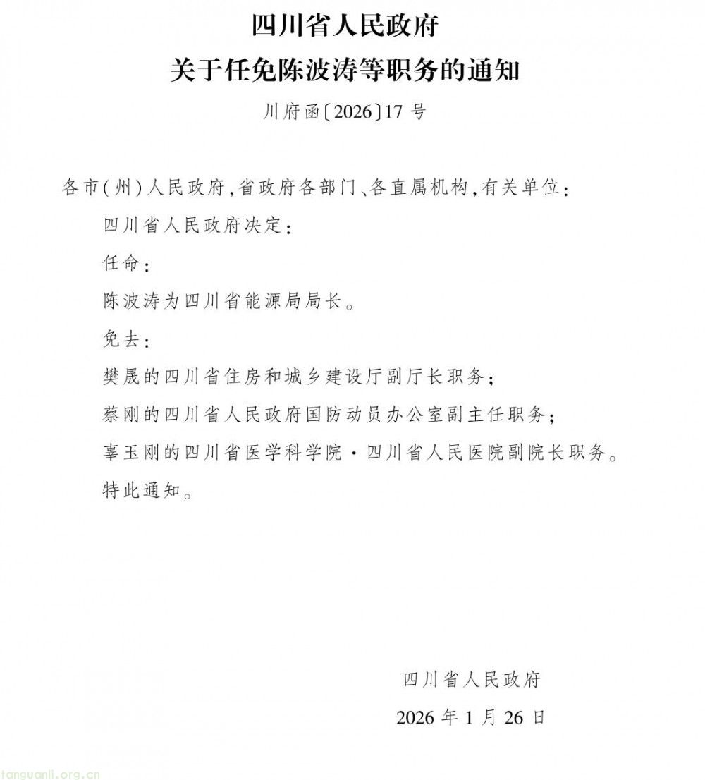 1月28日,四川省人民政府发布《关于任免陈波涛等职务的通知》,任命陈波涛为四川省能源局局长。