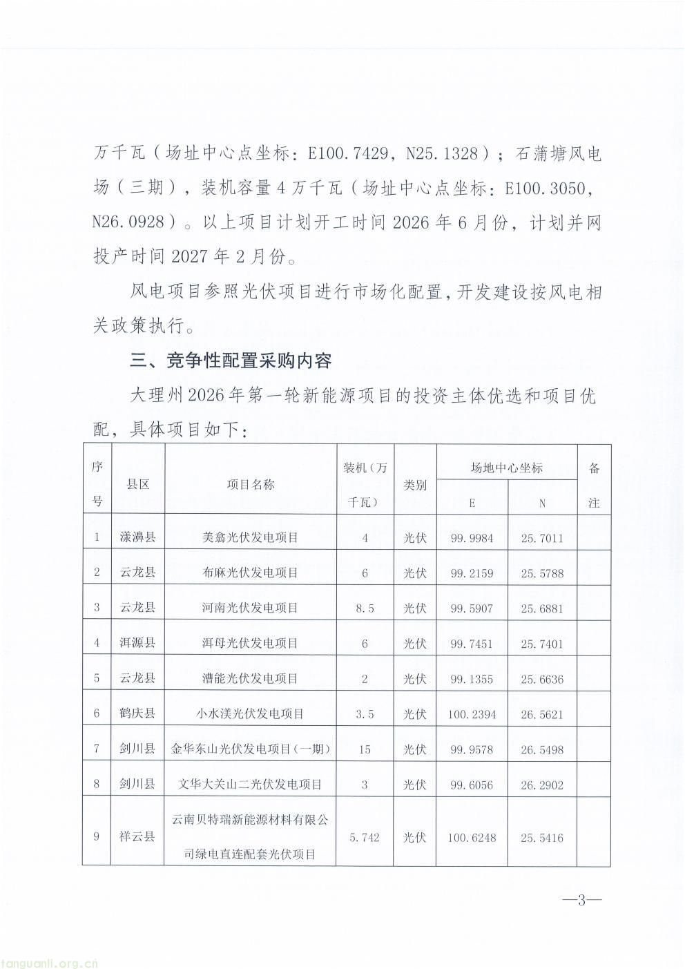3 月 5 日,云南省大理州发展改革委、州能源局发布 2026 年第一轮新能源项目竞争性配置公告。本次共安排 13 个新能源项目参与竞争配置,总装机容量 70.507 万千瓦,其中光伏项目 9 个、规模 53.742 万千瓦,风电项目 4 个、规模 16.765 万千瓦。项目计划于 2026 年 6 月开工建设,2027 年 2 月实现并网投产。公告明确,风电项目参照光伏项目实行市场化配置,开发建设管理按照国家及云南省风电相关政策执行。大理州通过规范有序开展新能源项目竞争性配置,进一步优化能源结构,加快推动绿色能源开发利用,助力区域新能源产业高质量发展和碳达峰碳中和目标实现。