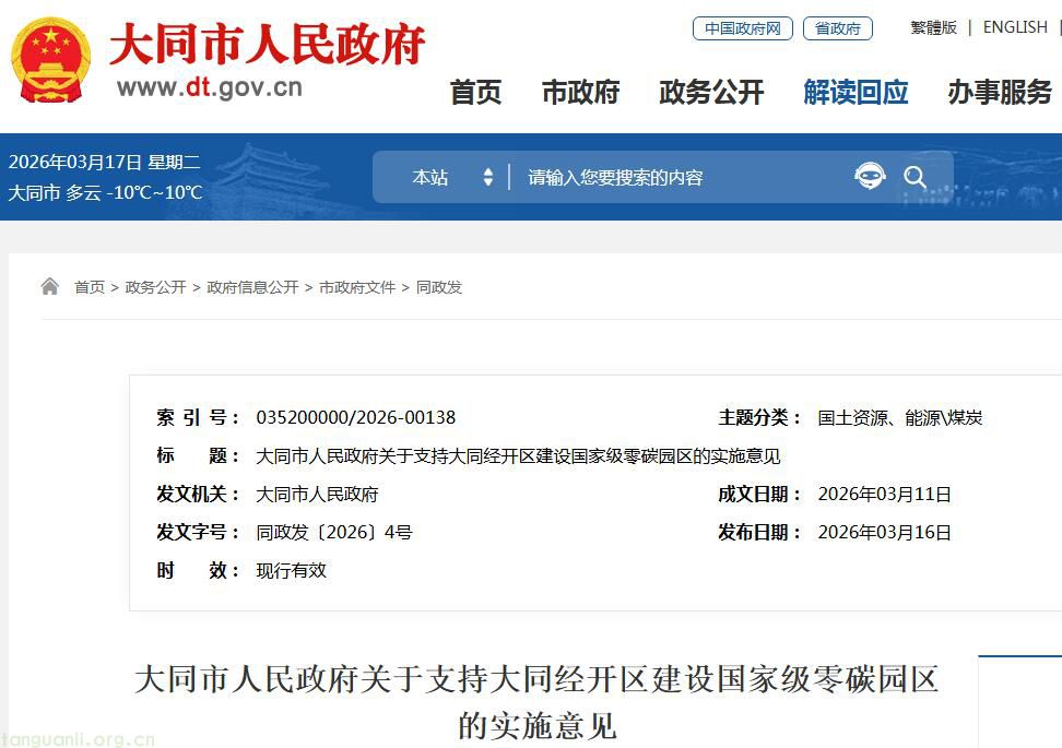 3月16日,山西省大同市人民政府正式印发《关于支持大同经开区建设国家级零碳园区的实施意见》,深入落实国家和省关于碳达峰碳中和及国家级零碳园区建设的部署安排,立足大同能源禀赋与产业基础,为大同经开区创建国家级零碳园区划定清晰路径、明确核心目标,助力区域绿色低碳转型。