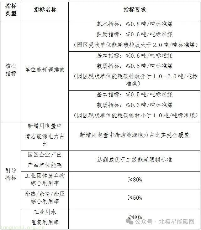 核心指标:零碳园区建设必须达到的目标,是园区验收评估的首要条件,按照园区年综合能耗规模分为两类。达不到核心指标要求的园区,原则上不得申请验收。