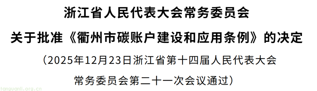 2025年11月28日衢州市第八届人民代表大会常务委员会第二十九次会议通过的《衢州市碳账户建设和应用条例》,已于2025年12月23日经浙江省第十四届人民代表大会常务委员会第二十一次会议批准,现予公布,自2026年5月1日起施行。