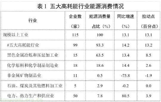 (三)五大高耗能行业“三升两降”。一季度,五大高耗能行业综合能源消费量同比增长14.2%,占规上工业综合能源消费量93.3%,拉动规上工业综合能耗增速13.2个百分点。其中,占比63.5%的黑色金属冶炼和压延加工业能源消费量同比增长13.4%,拉动规上工业综合能耗增速8.5个百分点;电力、热力生产和供应行业、化学原料和化学制品制造业能源消费量同比增长80.5%、14.4%,分别拉动规上工业综合能耗增速3.9、2.6个百分点。