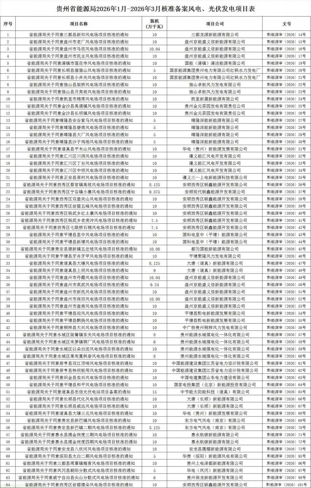 根据《省人民政府关于印发贵州省企业投资项目核准和备案管理办法的通知》(黔府发〔2018〕第7号),按照程序,贵州省能源局2026年1月-2026年3月核准备案风电、光伏发电项目64个,现将有关情况公布如下。