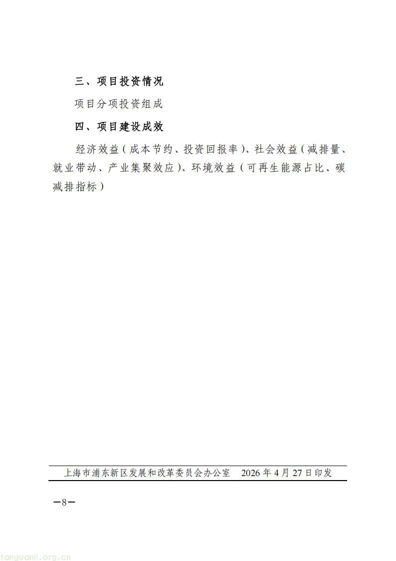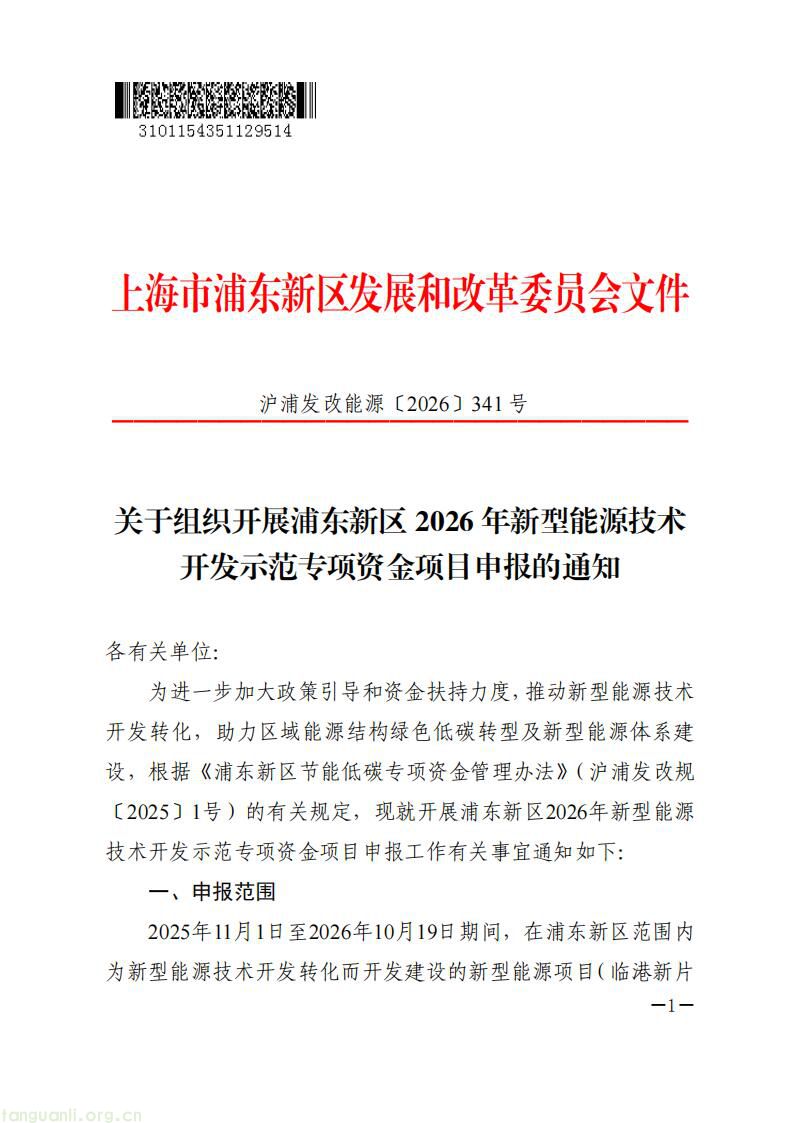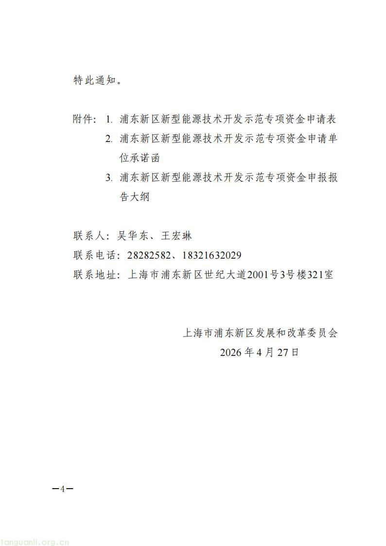 4 月 29 日,上海市浦东新区发改委正式印发通知,启动 2026 年新型能源技术开发示范专项资金项目申报工作,面向辖区内符合条件的新能源技术开发与转化类项目给予政策资金扶持,助力区域新能源产业创新升级与规模化落地。